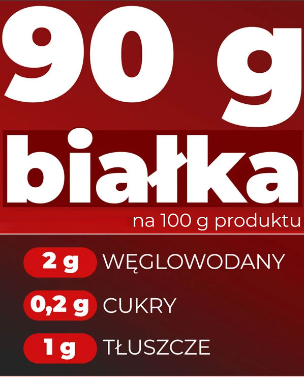 | 90 g białka w 100 g produktu | Zero laktozy i glutenu |