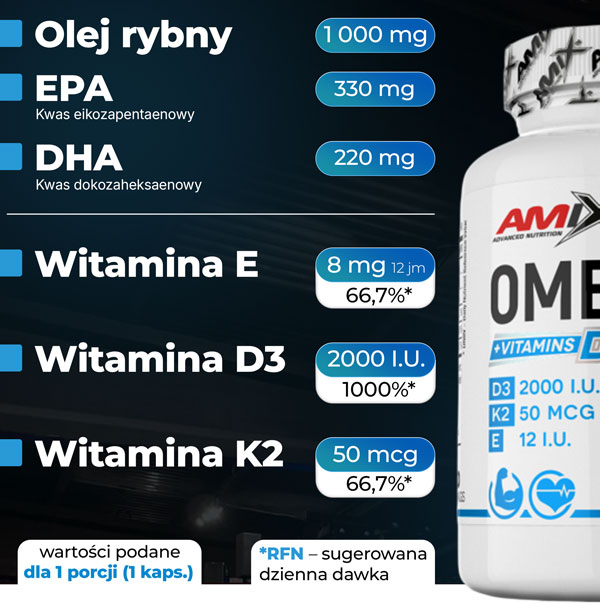 Większość suplementów zawiera wyłącznie kwasy omega-3, ale Amix Omega-3 D3+K2+E to kompleksowa formuła 4w1. Oprócz wysokiej jakości EPA i DHA znajdziesz tu witaminę D3, która wspiera odporność i kości, witaminę K2, która pomaga dbać o serce i układ krążenia, oraz witaminę E chroniącą komórki przed stresem oksydacyjnym. To suplement dla osób, które oczekują czegoś więcej niż standardu.
